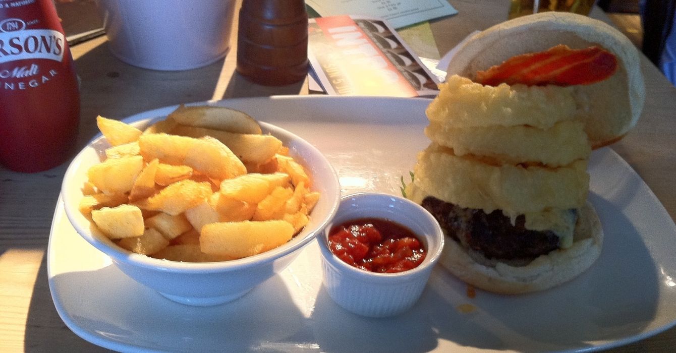 On a return visit I have hand made beef burger, topped with cheese, crispy bacon, tempura onion rings and proper chips (£11.95, pictured) – a good burger, if not mind-blowing. The onion rings are fresh, light and not greasy – and the burger obviously home made but lacking real meaty punch that you would expect. The chips (same as on fish fillets) are great, doused in vinegar.
