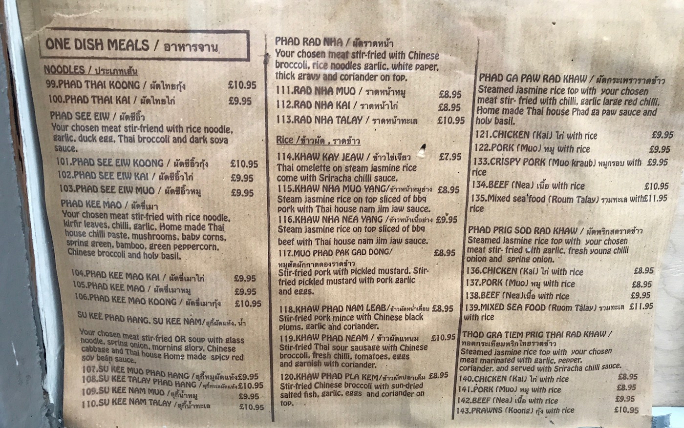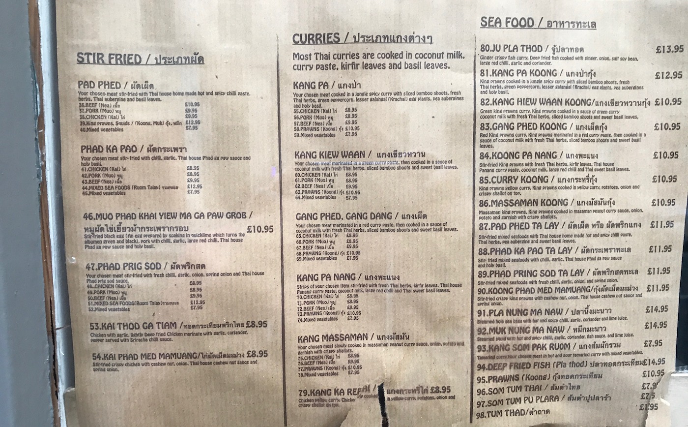 The menu is large, (I’ve gone to the liberty of including it at the bottom of the page as you’ll not see it online) and spans Thailand and then some – curries, noodles, soups, and everything in between including, for the brave – chitterlings. Maybe next time.
