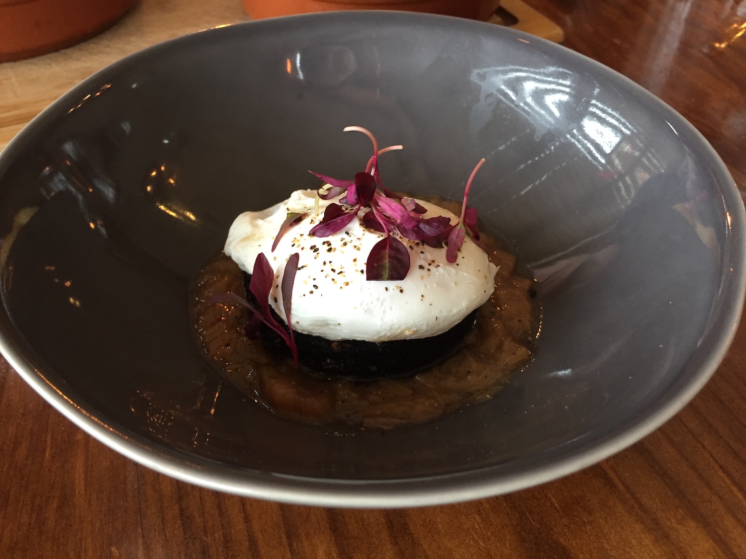 Two other favourites – crunchy brown shrimp bhaji with smoked haddock and sweet curry sauce ticks so many of my boxes, and this black pudding/rhubarb/poached egg combo, which equally surprised and delighted. It’s nowt complex but so deft and at the end of the day just tastes delicious.